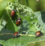 Symptoms: Circular holes in leaves, yellowed foliage, and scarred pods with feeding marks.