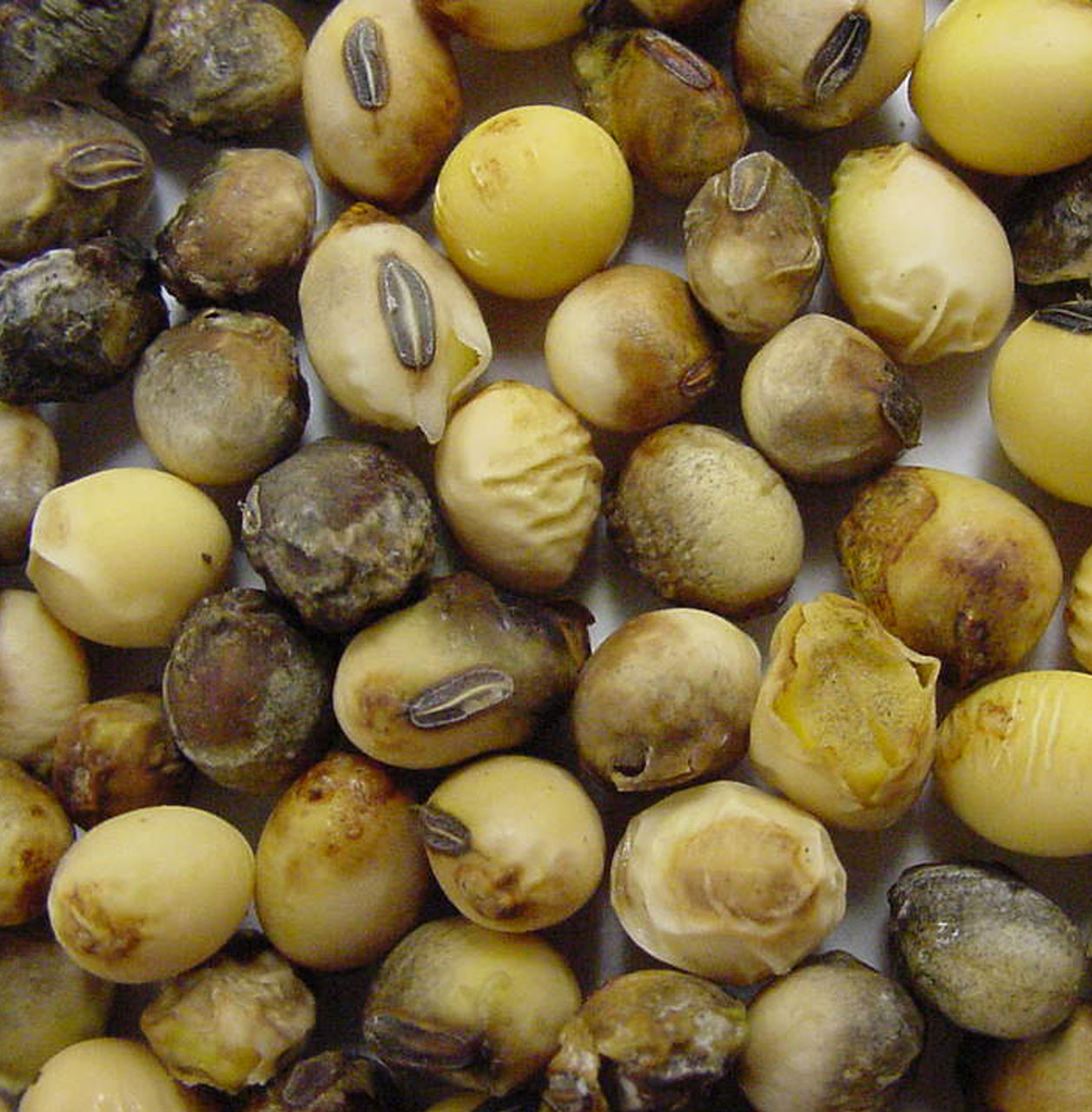 Symptoms: Purple to dark brown lesions on pods and seeds.